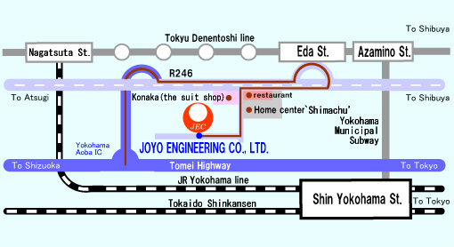 ①히가시메이{東名}자동차 도로 「요코하마 아오바{yokohama aoba}IC」에서 하차하시고 「에다{eda}、카와사키{kawasaki}방향」(국도246호선의